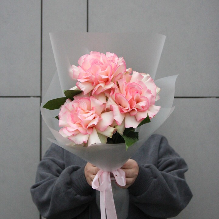 Нежный букет из трёх французских роз " Розовый комплимент" (Букет 151)