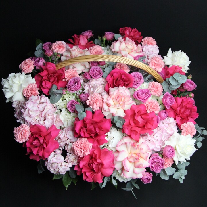 Состав букета: Французская роза, Гвоздика, Роза, Пионовидная роза, Гортензии