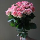 «Розовая мечта»: букет, который говорит без слов Представьте нежный вихрь лепестков, застывший в идеальной форме. Именно так можно описать этот букет — он словно воплощает собой лёгкость утреннего бриза и теплоту первых солнечных лучей. Розовые розы, собранные в пышную округлую композицию, создают ощущение гармонии и умиротворения. Форма букета — классическая округлая, но с лёгкой небрежностью, которая придаёт ему естественности. Высота композиции около 50 см, а диаметр варьируется в пределах 30–40 см — достаточно внушительно, чтобы произвести впечатление, но не слишком громоздко. Розы расположены плотно, их бутоны слегка перекрывают друг друга, создавая эффект объёмности. Оттенки лепестков плавно перетекают друг в друга: от почти белого у основания до нежно-розового на кончиках, будто запечатлён момент рассвета. Зелёная листва, обрамляющая букет, добавляет контраста и подчёркивает нежность розовых бутонов. Листья выглядят свежими и сочными, гармонично дополняя цветочную композицию. Букет оформлен минималистично: стебли аккуратно перевязаны белой лентой, что придаёт ему лаконичность и элегантность. Отсутствие лишней упаковки позволяет полностью оценить красоту роз. Каждая роза в этом букете — результат тщательного отбора. Флористы собирают композицию из свежих цветов, уделяя внимание каждой детали: от расположения бутонов до баланса оттенков. Мы стремимся, чтобы каждый собранный букет максимально точно соответствовал представленному на фото варианту. Такой букет подойдёт для самых разных поводов: чтобы порадовать любимую женщину, отметить важную дату, выразить благодарность или просто создать атмосферу уюта и тепла. Он одинаково уместен и на романтическом свидании, и в качестве знака внимания коллеге, и как способ сказать «я думаю о тебе» без лишних слов. «Розовая мечта» — это не просто цветы, это настроение, которое вы дарите вместе с букетом.