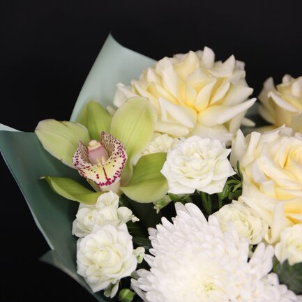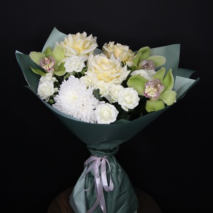 Белоснежная матрикария добавляет букету лёгкость и ощущение летнего утра, а кустовые хризантемы создают объём и радуют стойкостью. Зелёная упаковка подчёркивает натуральность композиции и делает её особенно уютной и «живой».