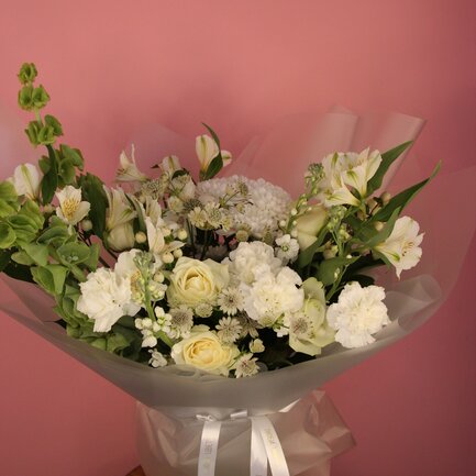 Этот букет — словно застывший миг раннего утра, когда первые лучи солнца нежно касаются лепестков цветов. Композиция завораживает своей утончённой простотой и гармонией: округлённая, слегка асимметричная форма создаёт ощущение естественной лёгкости, будто цветы только что собрали в саду.