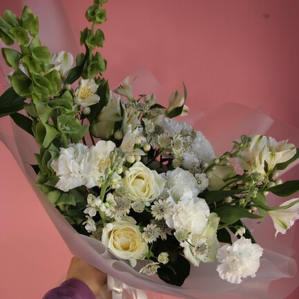 Букет упакован в нежную бумагу пастельного мятного оттенка — она подчёркивает свежесть композиции и придаёт ей завершённость. Атласная лента, аккуратно повязанная у основания, завершает образ, добавляя нотку элегантности. Высота букета около 40 см, диаметр — примерно 35 см: он достаточно объёмный, чтобы произвести впечатление, но не громоздкий.