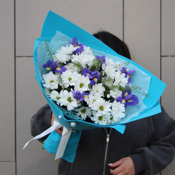 Букет из ирисов и кустовых хризантем — это яркая, динамичная и свежая композиция с красивым контрастом форм и текстур. Кустовые хризантемы добавляют объём и пушистость.