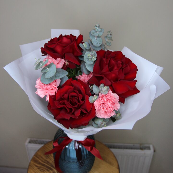 Состав букета: Гвоздика, Французская роза, Эвкалипт