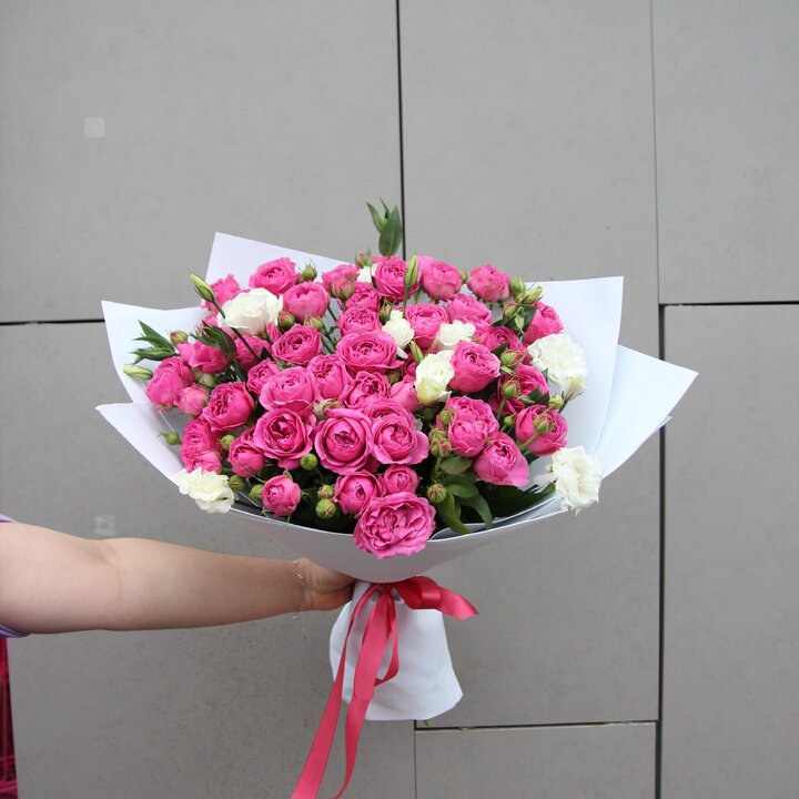 Пышные пионовидные розы покоряют своим утончённым ароматом, а нежная эустома придаёт композиции воздушность и лёгкое очарование. Цветы гармонично сочетаются между собой, создавая ощущение мягкости и естественной красоты. Такой букет станет идеальным подарком для самого особенного случая — свадьбы, юбилея, дня рождения или просто, чтобы выразить любовь и восхищение.