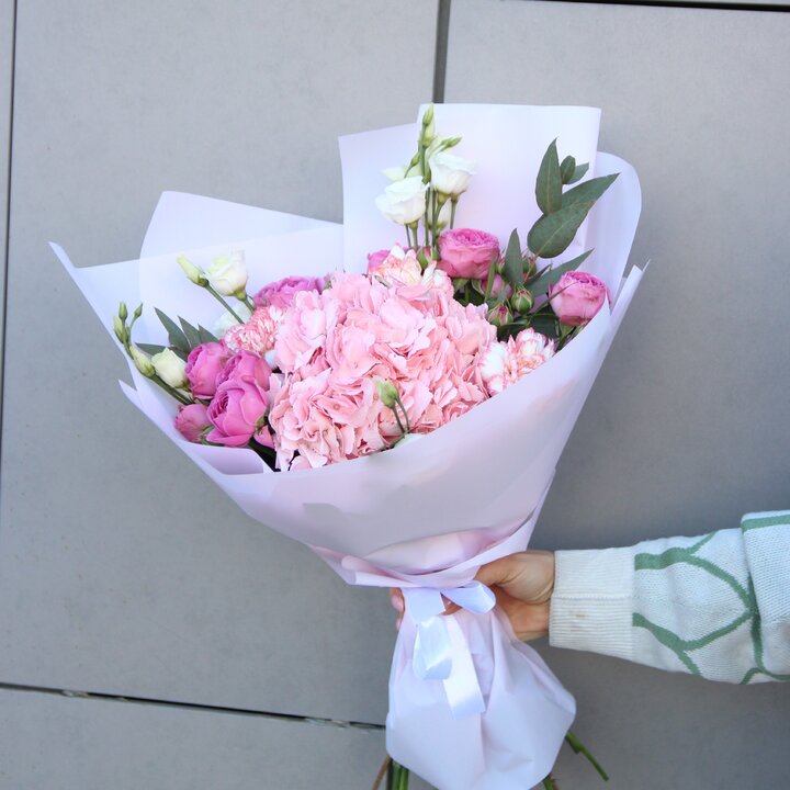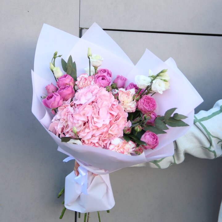 Состав букета: Гортензия, Пионовидная роза, Гвоздика, Эустома, Эвкалипт