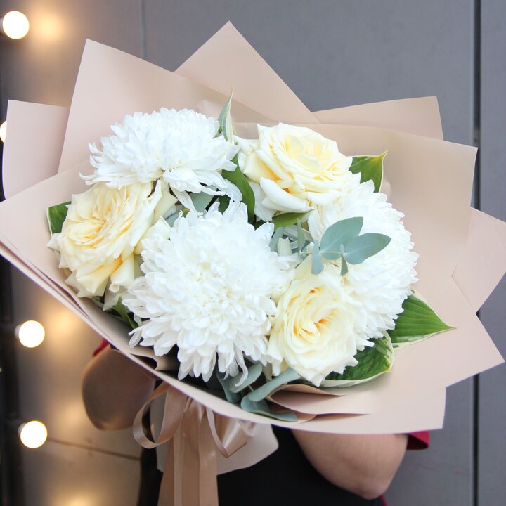 Состав букета: Розы, Хризантемы, Эвкалипт