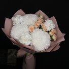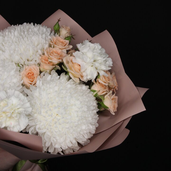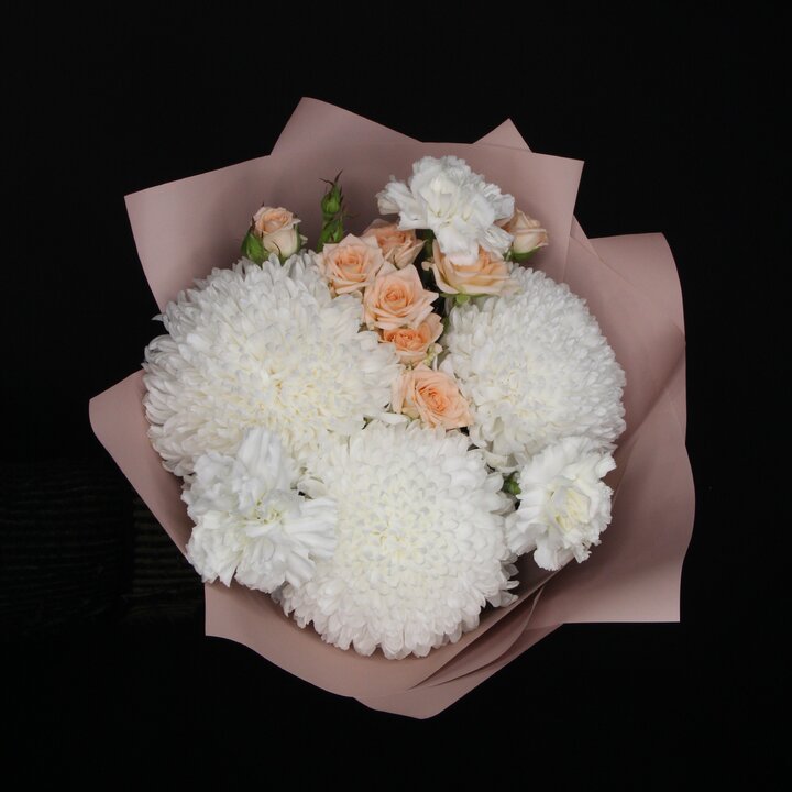 Этот нежный букет объединяет крупные пушистые белые хризантемы и утончённые кремово-персиковые розы. Контраст фактур делает композицию особенно выразительной: воздушные шары хризантем создают объём и мягкость, а миниатюрные розы добавляют изысканность и тепло.