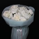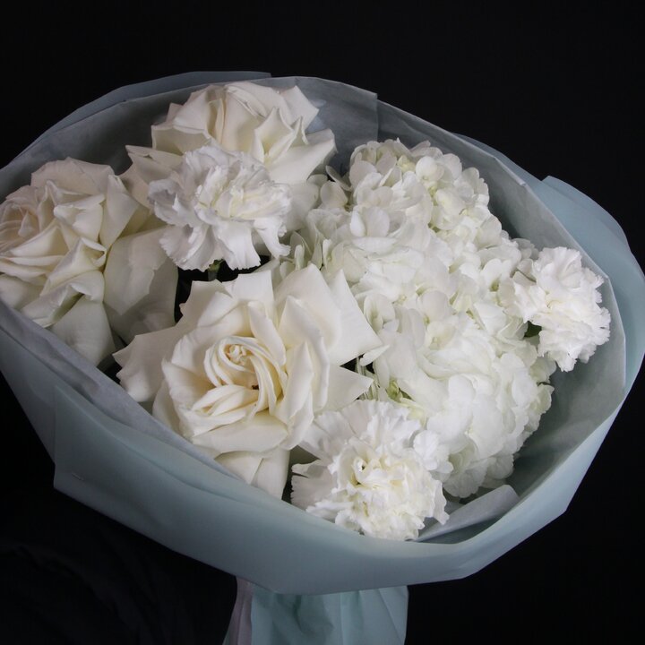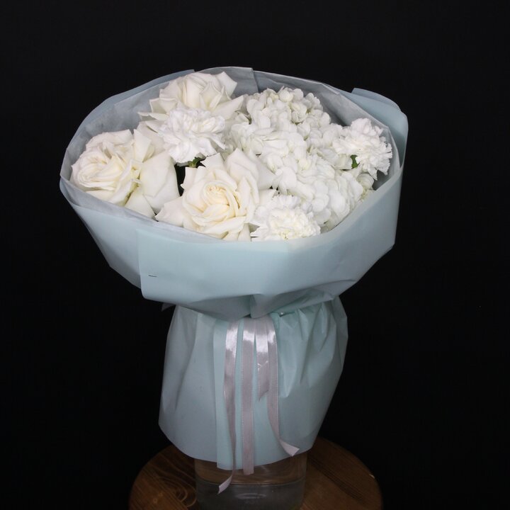 Этот белоснежный букет воплощает чистоту и утончённость. Светлые цветы создают ощущение лёгкости и спокойствия, а воздушная голубая упаковка подчёркивает их нежность, добавляя композиции свежести и лёгкого холодного сияния.