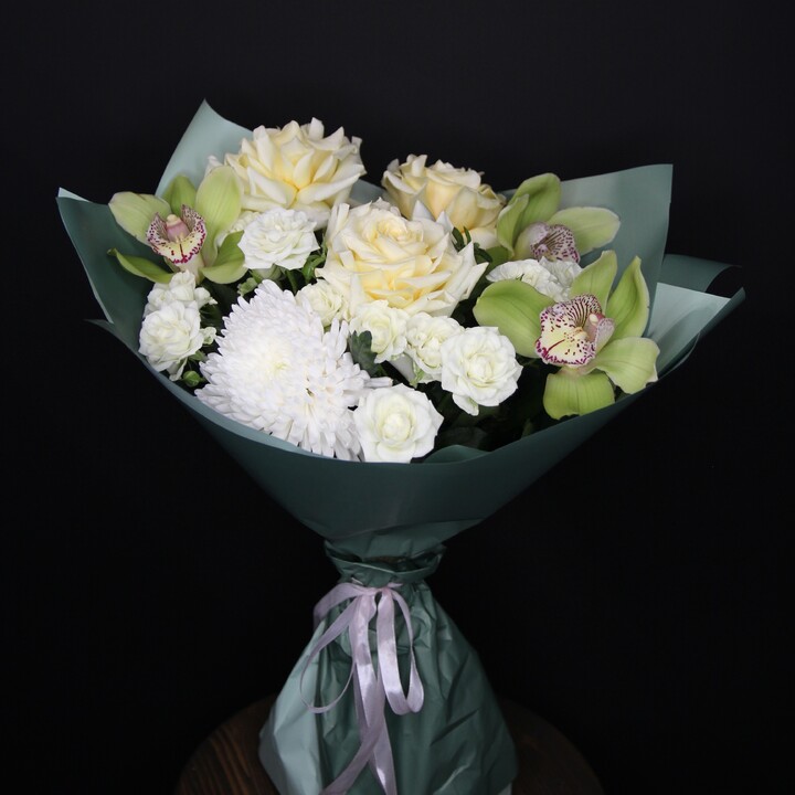 Зеленый лепестки цимбидиума привносят в композицию экзотическую изысканность и лёгкую архитектурность, в то время как белые розы добавляют мягкость, воздушность и благородство. Такой букет выглядит современно, стильно и выразительно — идеально подойдёт для особого случая, для поздравления или как элегантный жест внимания.