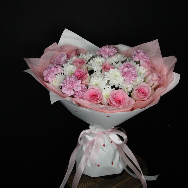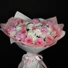 Роскошный розовый букет из изысканных роз, нежных хризантем и утончённых гвоздик — про внимание, заботу и «ты для меня особенная». Объёмный, стильный, с идеальным балансом нежности и статуса. Такой букет не просто дарят — им восхищаются, его фотографируют и вспоминают. Если хотите произвести вау-эффект и попасть прямо в сердце, вы его уже нашли