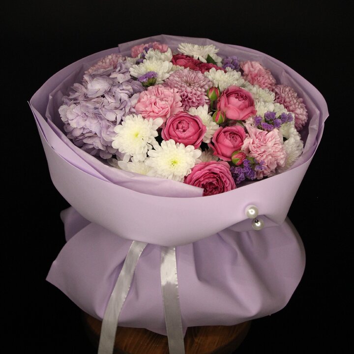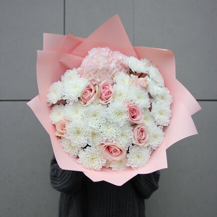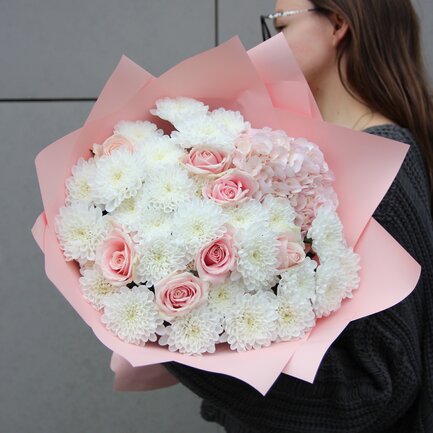 Состав букета: Пионовидная роза, Гортензия, Хризантема кустовая