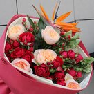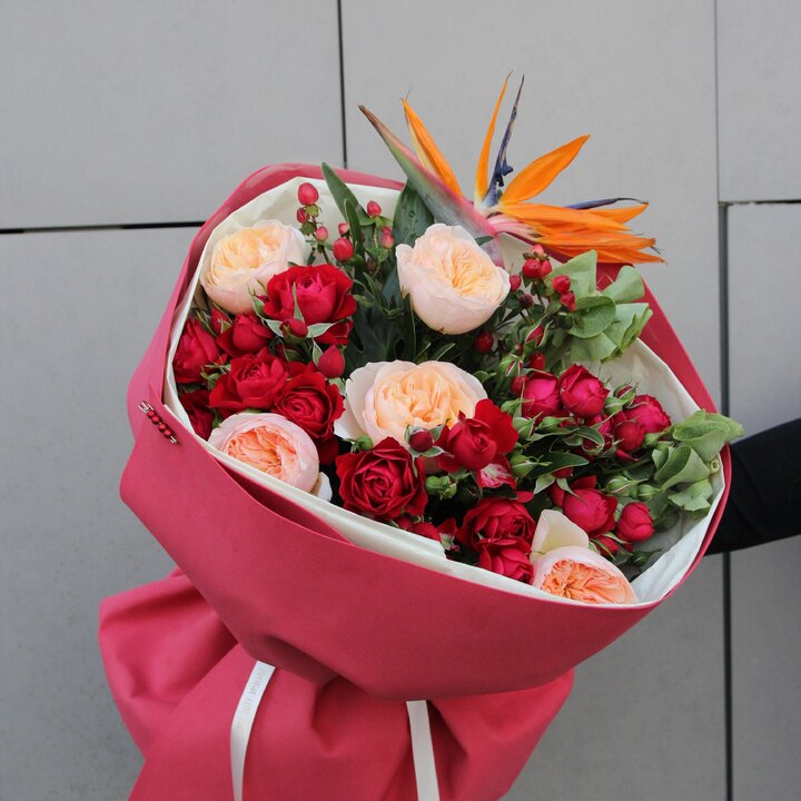 Состав букета: Стрелиция, Пионовидная роза, Роза, Гиперикум, Кустовая роза