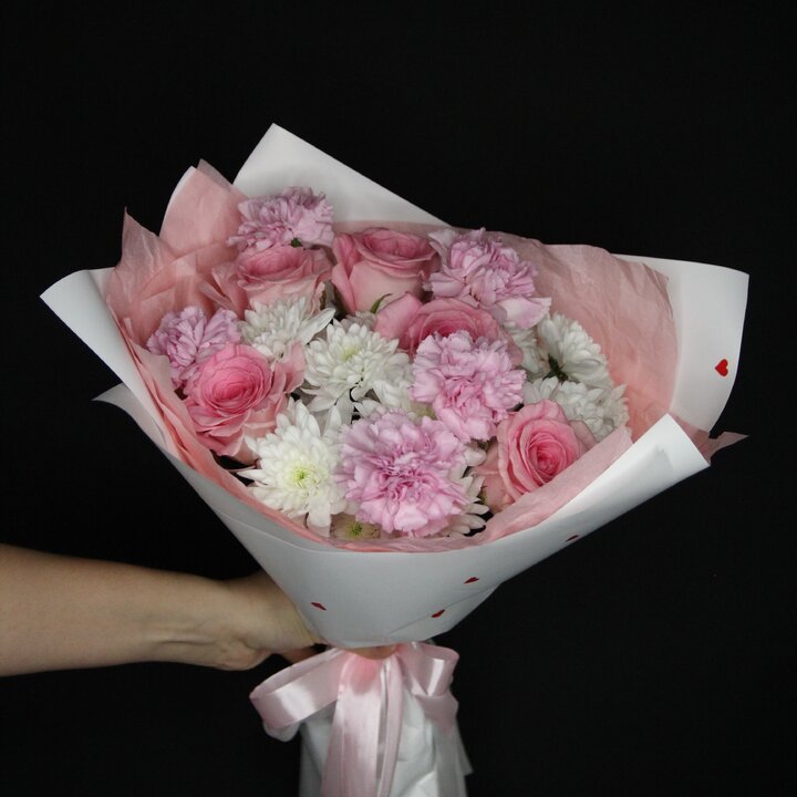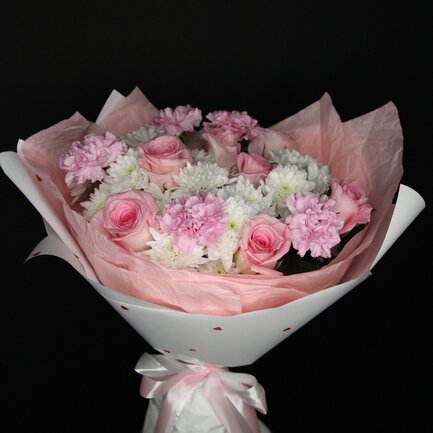 Состав букета: Роза, Кустовая хризантема, Гвоздика