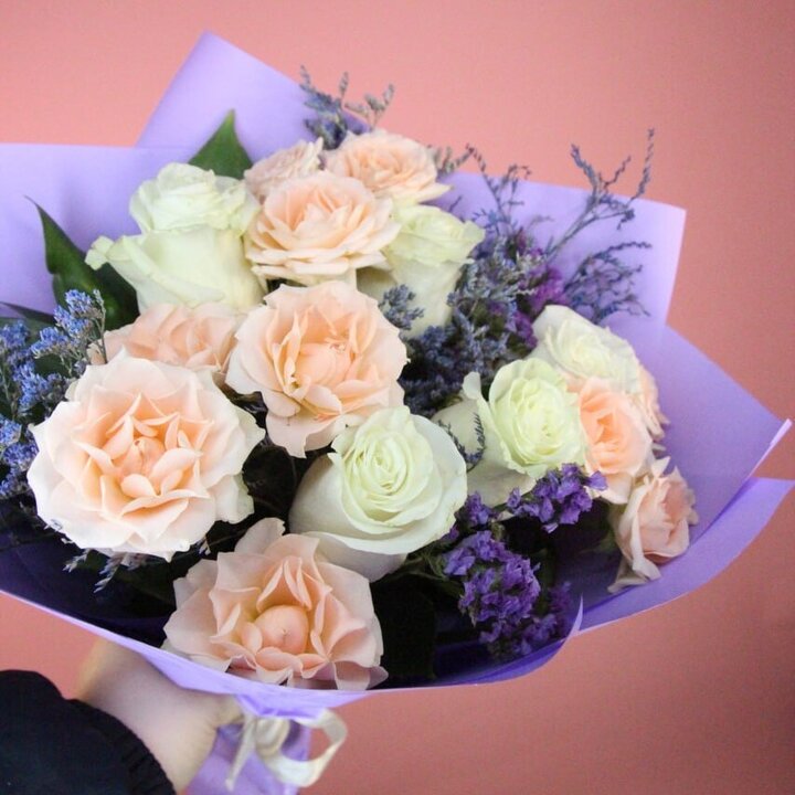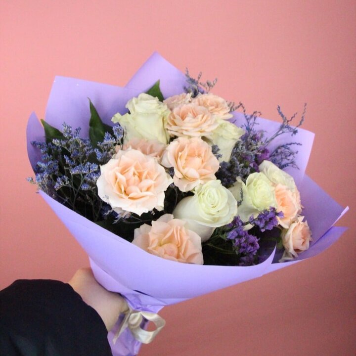 Состав букета: Кустовая роза, Роза, Лимониум, Статица