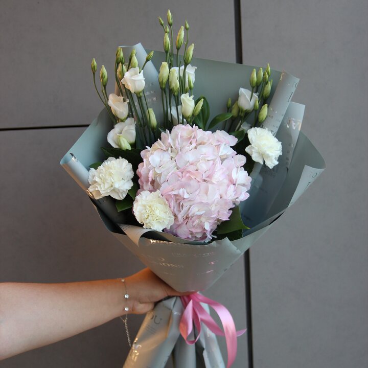 Эустомы придают композиции изысканность, гортензия — пышность и стойкость, а гвоздика добавляет свежести и ярких акцентов. Несмотря на компактный размер, букет выглядит эффектно и дарит по-настоящему праздничное настроение.