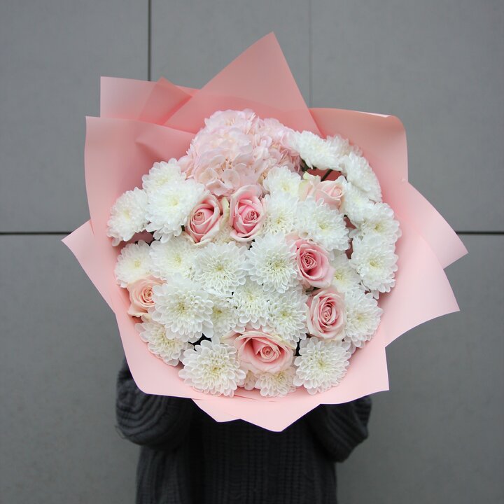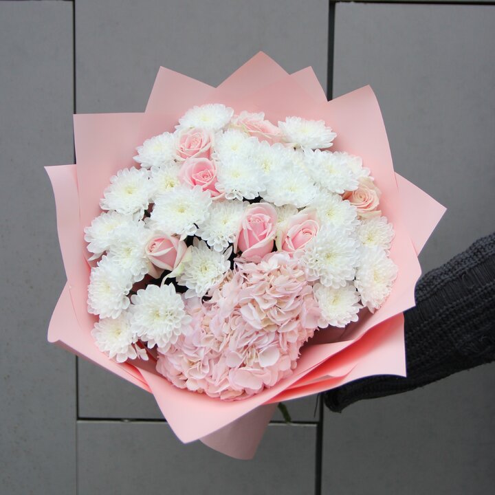 Состав букета: Гортензия, Роза, Кустовая хризантема