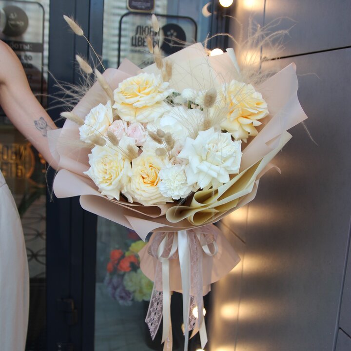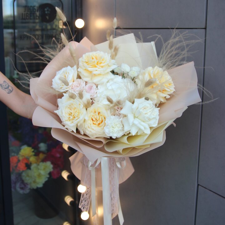 Флорист соберет вам букет из подходящей гаммы, максимально соответствующей букету на фотографии