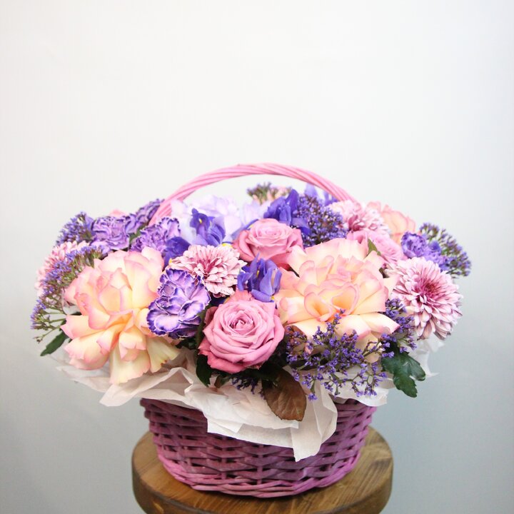 Корзина в лиловых тонах с розами (ВОХ 46)