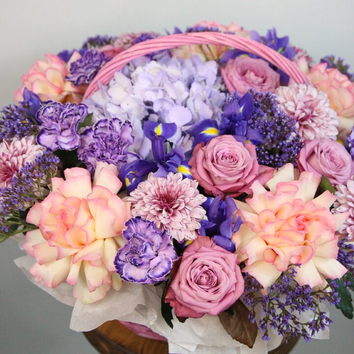 Состав букета: Розы, Хризантемы, Ирисы, Диантусы, Гортензия, Лимониум