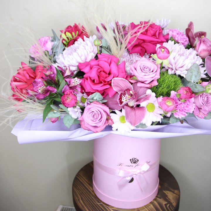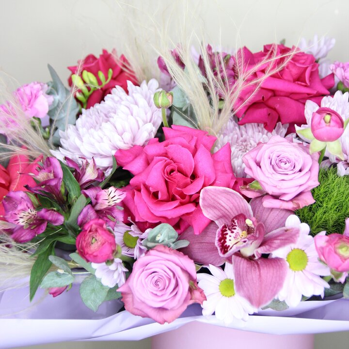 Состав букета: Альстромерия, Роза, Хризантема кустовая, Фрезия, Хризантема, Цимбидиум, Гвоздика