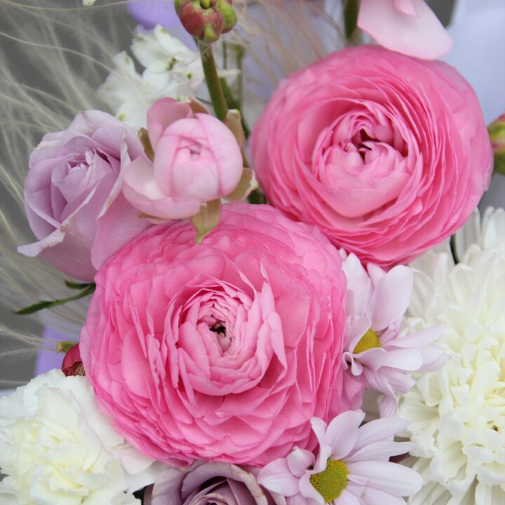 Состав букета: Ранункулюс, Хризантема, Гвоздика, Кустовая роза