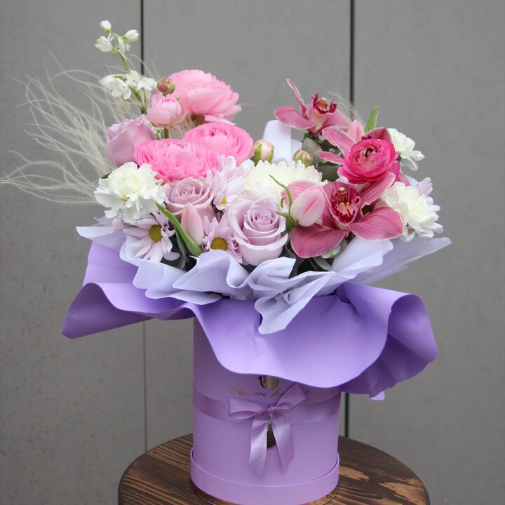 Композиция с ранункулюсами в сиреневых тонах (Вох 65)