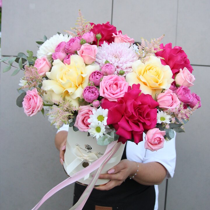 Коробка с французскими розами, хризантемой и пионовидными розами (Вох 72)