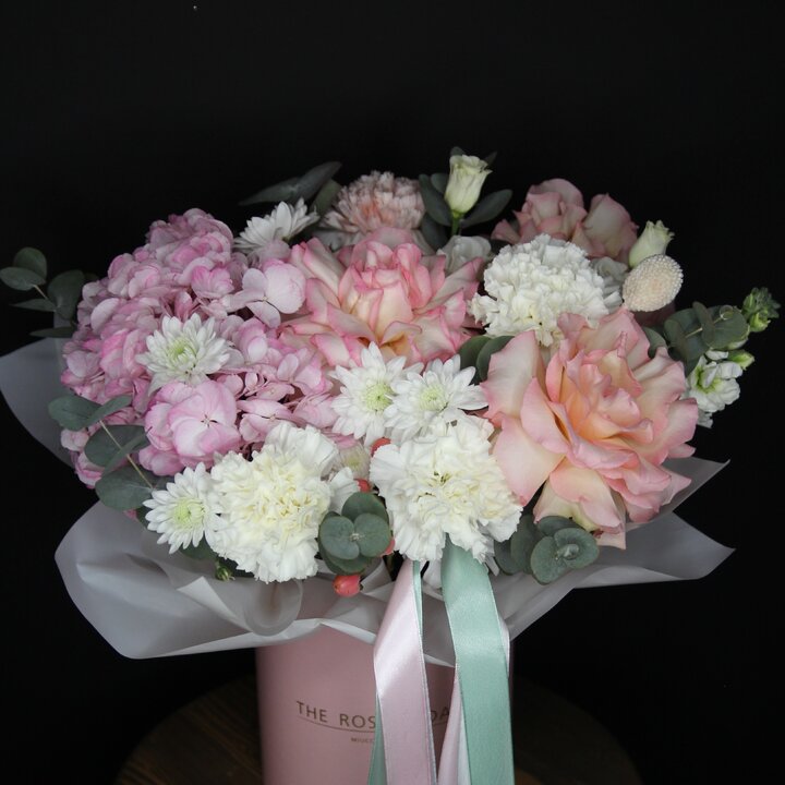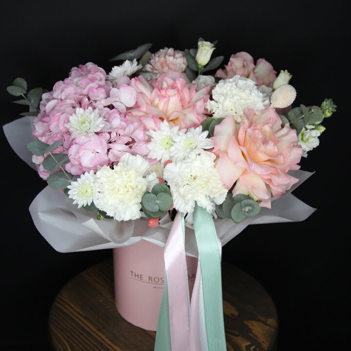 Состав букета: Французская роза, Кустовая хризантема, Гвоздика, Гортензии