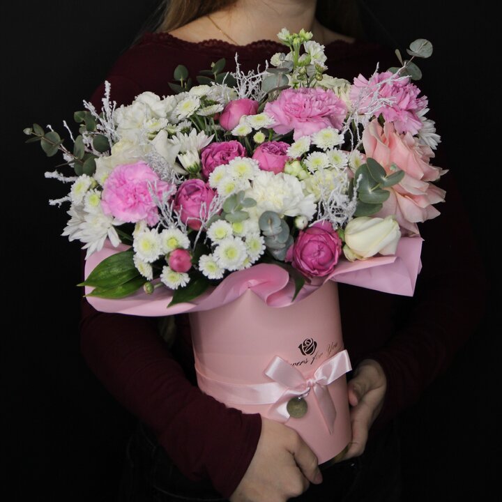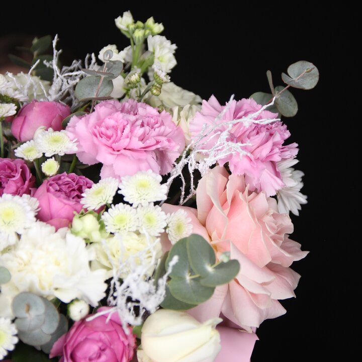 Композиция в розовых тонах с розами и диантусами (Вох 85)