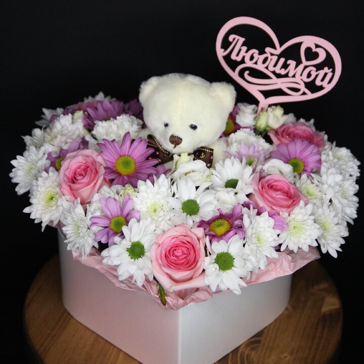 Сердце с мишкой и хризантемами (ВОХ 27)