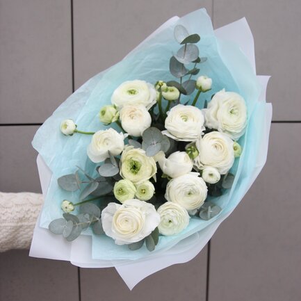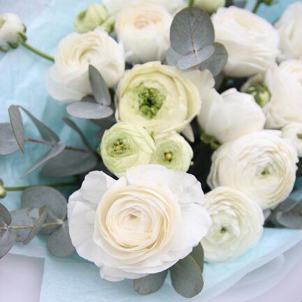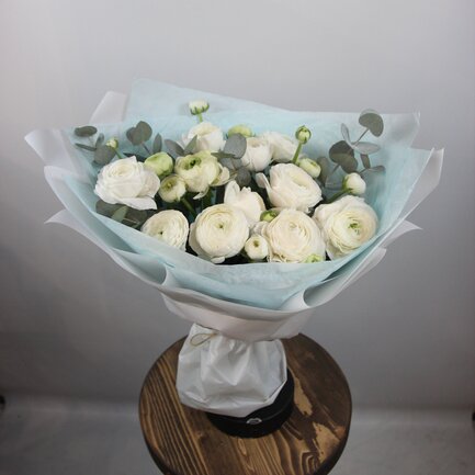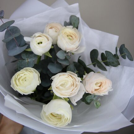 Букет из 7 ранункулюсов с эвкалиптом (Моно 09)