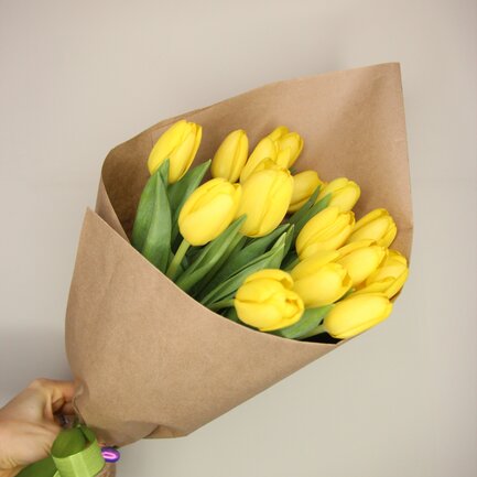 Букет из 15 желтых гладких тюльпанов в крафте (Моно 23)