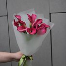 Этот букет — словно всплеск эмоций, застывший в изящной цветочной композиции. В центре внимания — 11 роскошных калл насыщенного розового оттенка с лёгкими переходами к малиновому. Их лепестки, будто вырезанные из шёлка, завораживают игрой цвета и формы. Изогнутые очертания цветов создают ощущение лёгкости и динамики, а компактная сборка придаёт букету элегантную сдержанность. Композиция упакована в полупрозрачную белую бумагу, которая деликатно подчёркивает нежность калл, не отвлекая внимания от их природной красоты. Изящный бант из атласной ленты приглушённого зелёного оттенка завершает образ, добавляя гармонии и свежести — мягкий контраст с розовой палитрой цветов. Объём букета умеренный, но выразительный: он не выглядит громоздким, при этом уверенно привлекает взгляд. Букет производит впечатление утончённости и трепетной искренности. Он словно рассказывает негромкую, но очень личную историю. Такой подарок подойдёт для множества поводов: можно преподнести его как романтический жест, чтобы выразить глубину чувств; удивить коллегу с днём рождения, продемонстрировав безупречный вкус; поблагодарить учителя или наставника, добавив теплоты к словам признательности. А ещё он станет изысканным знаком внимания без повода — просто чтобы подарить улыбку близкому человеку. Мы гарантируем свежесть цветов: каждый букет собирается непосредственно перед отправкой. Аккуратная сборка, тщательный подбор калл и бережная упаковка позволяют сохранить первозданный вид композиции при доставке. Позвольте этому букету передать ваши эмоции — чисто, искренне и красиво.