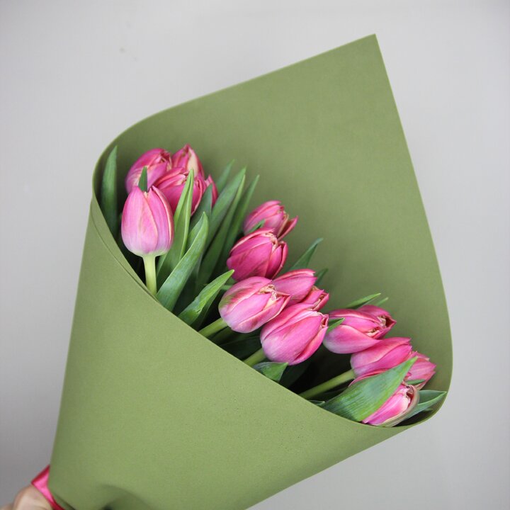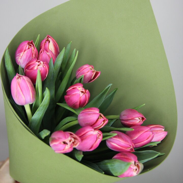 Букет из 15 розовых пионовидных тюльпанов в зеленом фоамиране (Моно 27)