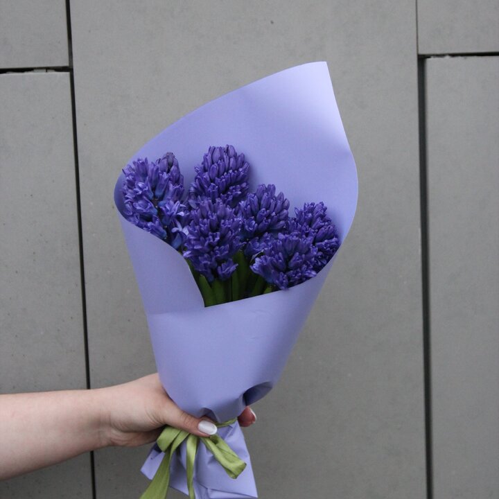 Букет «Моно 127»: очарование семи гиацинтов Этот букет — воплощение весенней свежести в самой изысканной форме. Семь гиацинтов глубокого фиолетового оттенка собраны в лаконичную композицию, которая сразу привлекает внимание своей утончённостью. Нежная упаковка в светло-лавандовом тоне подчёркивает природную красоту цветов, создавая ощущение лёгкости и гармонии. Форма букета напоминает мягкий всплеск — соцветия расположены так, что создают объёмную, но не перегруженную композицию. Фиолетовые гиацинты переливаются разными оттенками, будто впитали в себя закатное небо. Их плотные бутоны выглядят одновременно хрупко и насыщенно, а зелёные стебли добавляют природной естественности. Лёгкий аромат гиацинтов наполняет пространство нежной цветочной мелодией, создавая атмосферу уюта и спокойствия. Такой букет подойдёт для самых разных случаев. Представьте, как он украсит утренний кофе любимой женщины, добавит нотку элегантности деловому поздравлению или станет трогательным знаком внимания для близкого человека. Он также прекрасно впишется в интерьер как элемент декора, наполняя комнату весенней энергией. Особенность этого букета — в его природной простоте и изысканности. Мы тщательно отбираем свежие гиацинты с упругими лепестками и здоровыми стеблями. Композиция собирается вручную непосредственно перед отправкой, чтобы сохранить максимальную свежесть цветов. Аккуратная упаковка не только защищает букет, но и подчёркивает его эстетику. Порадуйте себя или близких этим удивительным букетом. Быстрая доставка гарантирует, что цветы дойдут до получателя в идеальном состоянии — свежими, ароматными и готовыми дарить радость.