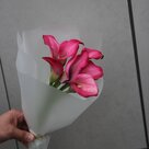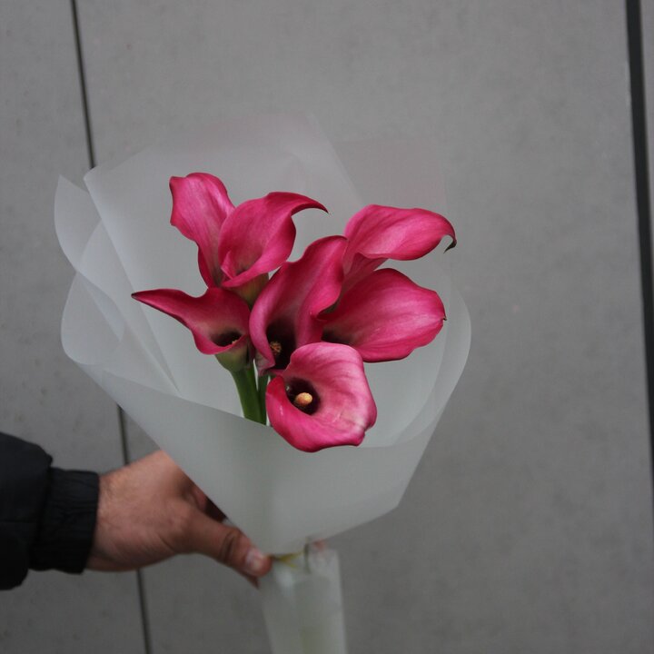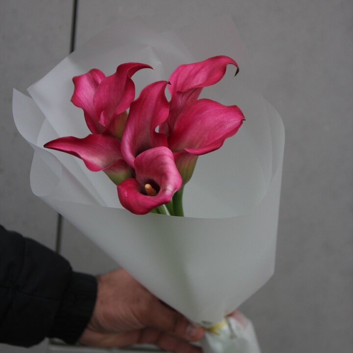 Букет из 7 розовых калл: изысканная простота в каждой детали Этот букет — воплощение элегантности и утончённости. Семь роскошных калл насыщенного розово-малинового оттенка собраны в компактную, но выразительную композицию. Их глянцевые лепестки, словно вырезанные из атласа, завораживают игрой света и тени. Лёгкие переливы цвета — от глубокого малинового у основания до нежного розового по краям — создают ощущение живой, пульсирующей красоты. Букет аккуратно упакован в полупрозрачную белую бумагу, которая подчёркивает благородство цветов, не отвлекая внимания от их природной грации. Такая упаковка придаёт композиции лёгкость и воздушность, делая её подходящей как для торжественного случая, так и для нежного знака внимания. Изогнутые формы калл напоминают танцевальные па — букет выглядит одновременно статично и динамично, будто замер в мгновении перед движением. Упругие зелёные стебли добавляют естественности и подчёркивают свежесть цветов. Такой букет подойдёт для самых разных поводов: чтобы порадовать близкого человека в день рождения; выразить уважение и признательность коллеге или начальнику; создать романтическую атмосферу на свидании; поблагодарить учителя, врача или другого важного человека; просто поднять настроение без особого повода. Композиция производит впечатление сдержанной роскоши. Она не перегружена деталями, но при этом невероятно выразительна. Представьте, как этот букет украсит интерьер, добавит изысканности рабочему столу или станет ярким акцентом в руках получателя. Мы гарантируем свежесть цветов: каждый букет собирается непосредственно перед отправкой. Бережная обработка и аккуратная сборка позволяют сохранить первозданную красоту калл до момента вручения. Позвольте этому букету стать вашим искренним посланием — стильным, запоминающимся и очень личным.