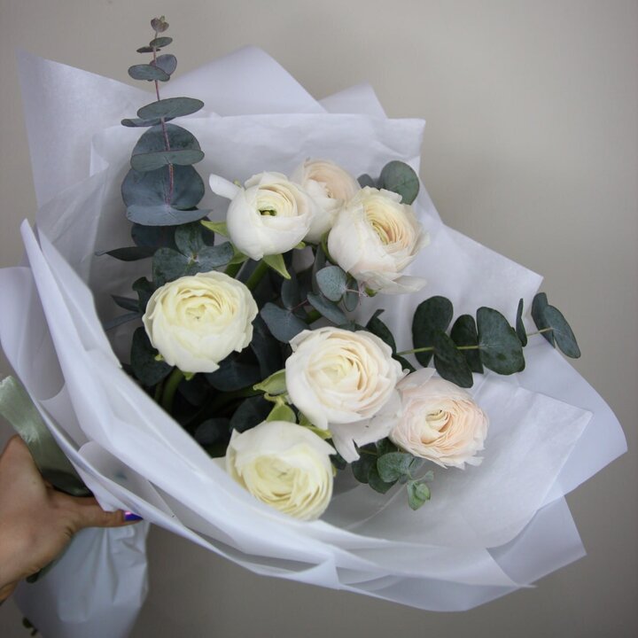 Букет из 7 ранункулюсов с эвкалиптом (Моно 09)