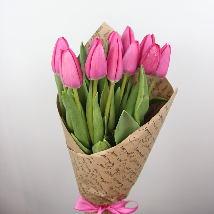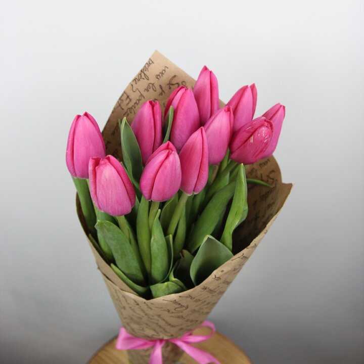 Букет из 11 гладких розовых тюльпанов в крафте (Моно 48)