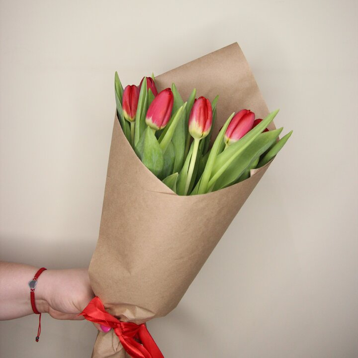 Букет «Тюльпановая зарисовка» — это воплощение весенней свежести в самой простой и трогательной форме. Композиция из 15 ярко-красных тюльпанов, аккуратно упакованных в натуральную крафт-бумагу, выглядит одновременно лаконично и изысканно. Форма букета — слегка расклёшенная, с естественным объёмом, который создаёт ощущение лёгкости. Насыщенный алый оттенок лепестков контрастирует с сочной зелёной листвой, придавая композиции живость и динамику. Крафтовая упаковка добавляет нотку уюта и экологичности, а яркая красная лента в основании завершает образ, подчёркивая праздничность момента. Этот букет производит впечатление искреннего, душевного подарка. Он не перегружен деталями, но при этом невероятно выразителен — как акварельный набросок, в котором каждый мазок наполнен смыслом. «Тюльпановая зарисовка» словно рассказывает историю о тёплых чувствах, заботе и внимании, заключённых в каждом лепестке. Такой букет будет уместен в самых разных ситуациях: чтобы поздравить коллегу с профессиональным праздником, порадовать маму в день рождения, создать романтическую атмосферу на свидании или просто поднять настроение близкому человеку. Он станет милым акцентом на семейном ужине, оживит интерьер в пасмурный день или превратит обычную встречу в маленькое торжество. Мы собираем «Тюльпановую зарисовку» непосредственно перед отправкой, тщательно отбирая только свежие тюльпаны с упругими бутонами и крепкими стеблями. Каждый цветок проходит проверку на качество, чтобы композиция доехала до получателя в идеальном состоянии. Гарантируем, что букет будет живым, ароматным и готовым дарить эмоции. Позвольте себе поделиться частичкой весны с близкими с помощью «Тюльпановой зарисовки»!