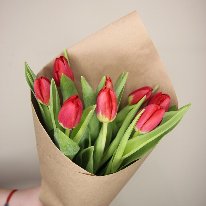 Букет из 9 красных гладких тюльпанов в крафте (Моно 15)