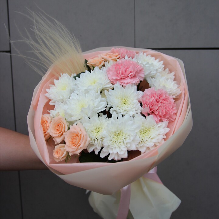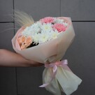 Состав букета: Кустовая хризантема, Кустовая роза, Гвоздика