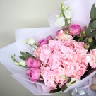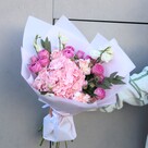 Состав букета: Гортензия, Пионовидная роза, Гвоздика, Эустома, Эвкалипт