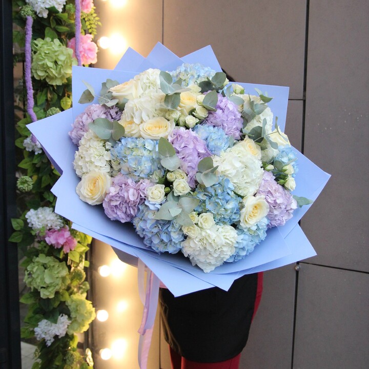 В основе букета — крупные, пышные шапки гортензий, собранные в плотную округлую форму. Голубые соцветия создают ощущение свежести и воздушности. Такой букет идеально подходит для торжественных случаев: юбилеев, свадеб, крупных праздников или в качестве эффектного подарка, который произведёт запоминающееся, благородное впечатление.
