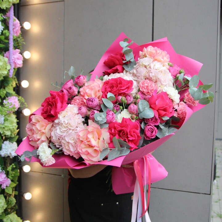 Состав букета: Кустовая роза, Пионовидная роза, Гвоздика, Гортензия