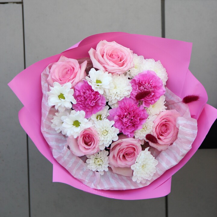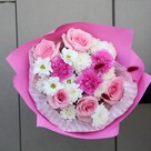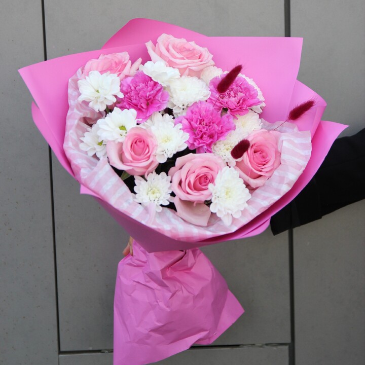 Состав букета: Гвоздики, Хризантема кустовая, Роза